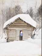 | maalaus: Vinter, gumma vid badstudörr i vinterlandskap (inv.kirja) |