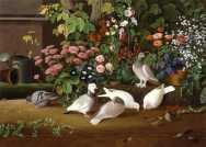 | maalaus: Kukkia ja lintuja puutarhan nurkassa |