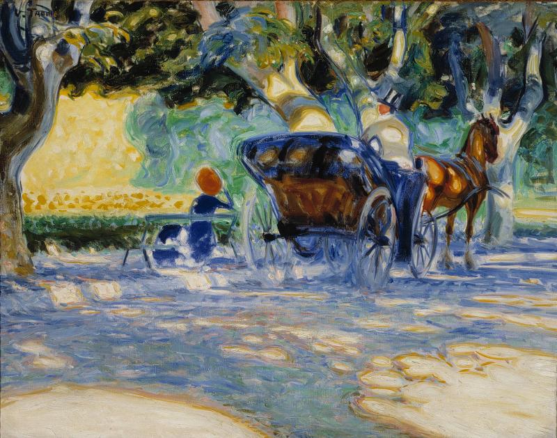 | asiasana | Ranska, hevonen, bench, varjo, maisema, lane, alley, eläimen vetämä kulkuväline (vaunut, rattaat jne.), puut, julkinen puisto, puisto kaupungissa, istuva figuuri, puisto |