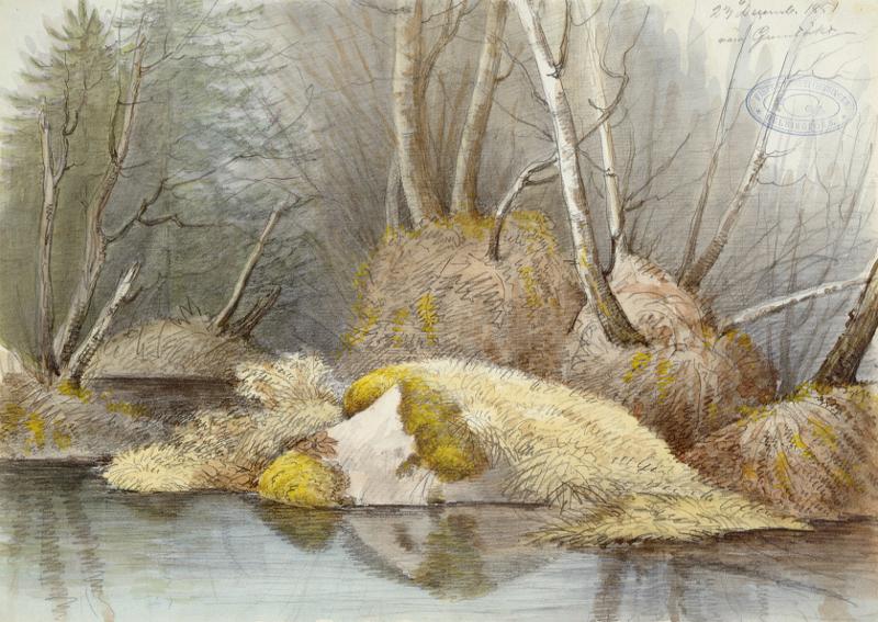| maalaus: Metsänsisus ja vedenpeittämät mättäät keväällä |