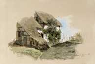 | maalaus: Reininmaalainen talonpoikaistalo, keskellä talon edessä lehtipuu |