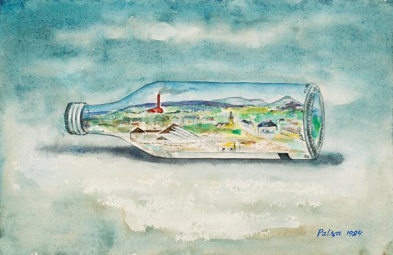 | asiasana | surreaalinen maisema, surrealistiset näkymät, kaupunkimaisema sekä ihmisen tekemät rakennukset osana maisemaa, lasiastiat: pullo, juomalasi, tuoppi, ruukku, vaasi jne. |
