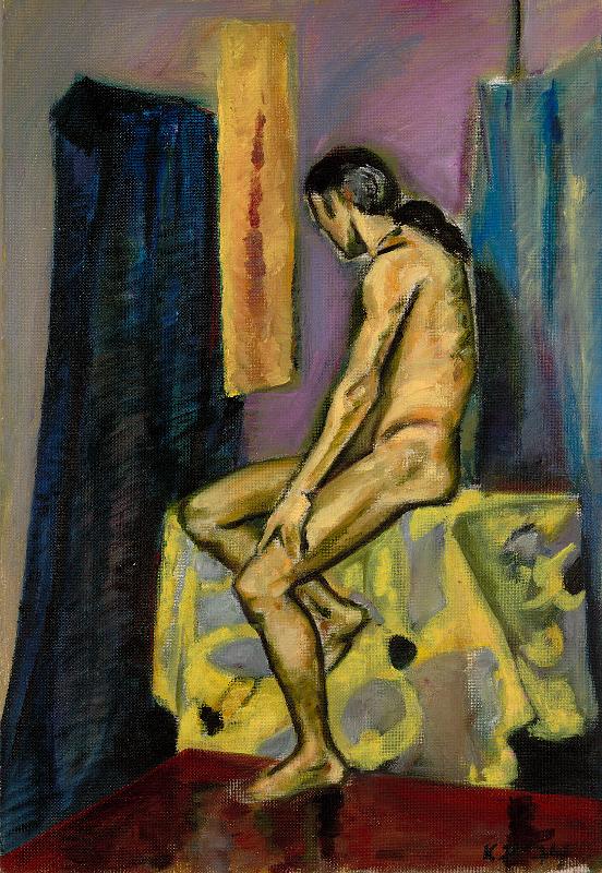 | asiasana | taiteilija (yleensä) työskentelemässä alastonmallin mukaan, aikuinen mies, ikkunaverhot, verhot, malli, profiilit, kuvat, istuva figuuri |