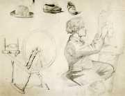 | piirustus: Harjoitelmat piirtäjästä telineen edessä, rukista, hatusta ja kenkäparista |