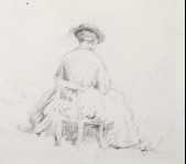 | piirustus: Vasemmalla kädet sylissä istuva huivipäinen talonpoikaistyttö, oikealla selin istuva hattupäinen nainen |
