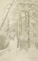 | huomiot | takana oksaharjoitelma ja teksti: Egendomligt för furuskogen: större och mindre fräd barrlösa nedantill, grå mossa på stenar och berg, deraf en dimmig grå ton utmed marken, först emot luften vidtaga lifligare färger.;takana vas.ylh. pystysuoraan: Tegning N=o 103. Finland, oik.alh.: Kuru 16 Juli 57. |