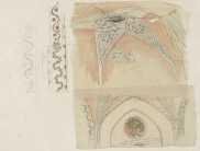| piirustus: Hyvän ja pahantiedon puu sekä ruusuköynnösornamentti, keskiholvin laessa käärme-aihe, luonnos Tampereen tuomiokirkon keskiholvia varten. |