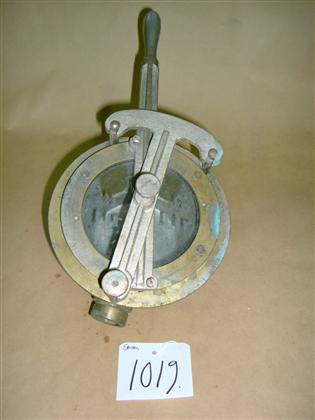 Pyöreä metallinen kullanvärinen mittari, jossa edessä on lasi. Lasin poikki kulkee pyöritettävä vipu, jonka pää pyöristetty kädensijaksi. Mittarissa alhaalla pyöreä reikä, samoin takana muttereilla kiinnitettynä pyöreä putki, joista se on saatu kiinnitettyä tukevasti.