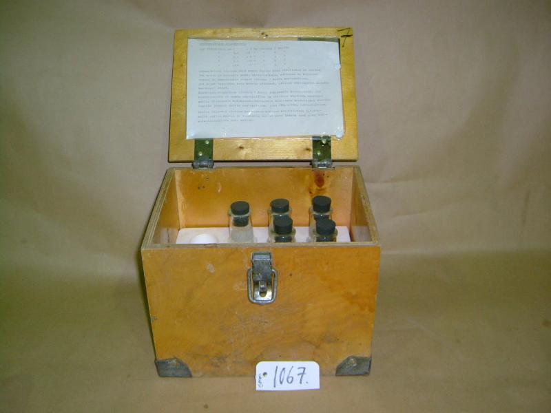 Puinen laatikko, jonka alakulmissa on metalliset vahvikkeet. Laatikossa on aukeava "läppäkansi", jossa on 2 saranaa. Kannen sivussa on lenkki, jonka saa kiinnitettyä kyljessä olevaan lukitusmekanismiin. Laatikossa on sisällä styroxi, jossa on 12 pyöreää reikää. 7:ssä on pystyssä lasinen näytepullo mustalla kumikorkilla. Pullojen kyljissä on teippiä, joihin on kirjoitettu kuulakärkikynällä. Pullojen päälle tulee toinen samanlainen reiällinen styrox. Sisäkanteen on nastoilla kiinnitetty valkoinen paperi taskun sisään, jossa on ohjeet näytemaitojen ottokerroista. Päällä on metallinen kahva ja kirjoitusta mustalla tussilla.