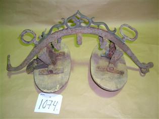2 puista soikeaa "tyynyä", joiden väliin kiinnitetty rautainen kaari, jonka päissä on koukut. Kaaren alla 3 neliönmuotoista rautaosaa. Päällä metallinen laineileva koristekuvio. Puun ja metallin välissä on nahkaosat.