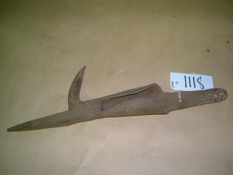 Toinen pää on litteä suorakaide, jossa on 2 reikää. Keskeltä rauta "rullalla" muodostaen putkimaisen avoimen osan. Toisessa päässä on rautainen piikki ja koukku. Pienehkö.