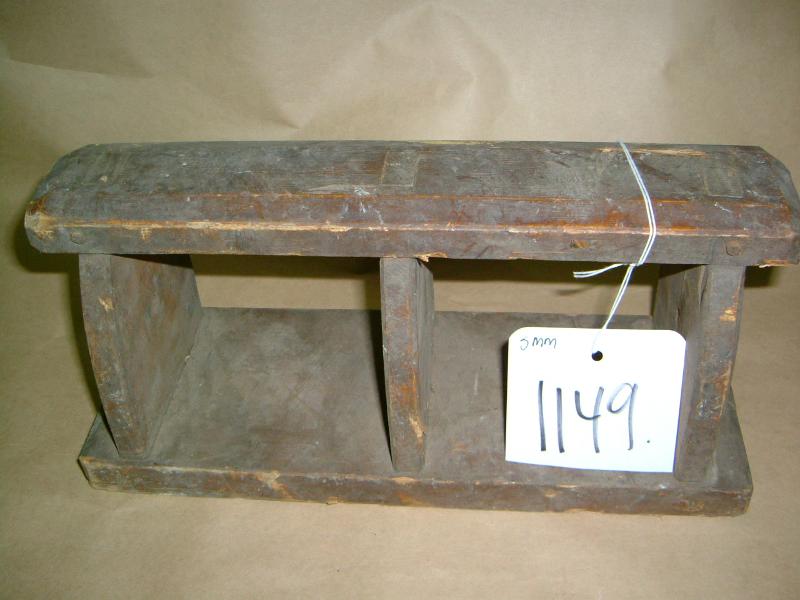 Ruskeaksi maalattu. Lauta, johon upottamalla ja puu- sekä rautanauloin kiinnitetty 3 pyöristettyä pystypuuta. Päällä toinen vaakalauta, joka on kapeampi kuin allaoleva. Pystylaudoissa on reiät keskellä.