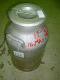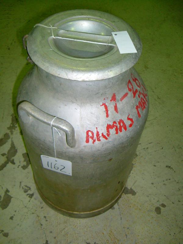 Hopean värinen lieriön muotoinen astia, joka kapenee yläosastaaan. Yläosan sivuissa on kahvat. Kansi tallella. Kannessa on myös kädensija ja sivussa metallilenkki, josta ollut kiinnitys sivussa olevaan metallilenkkiin, jotta kansi säilynyt tallella. Ketju tallella. 40 litran.