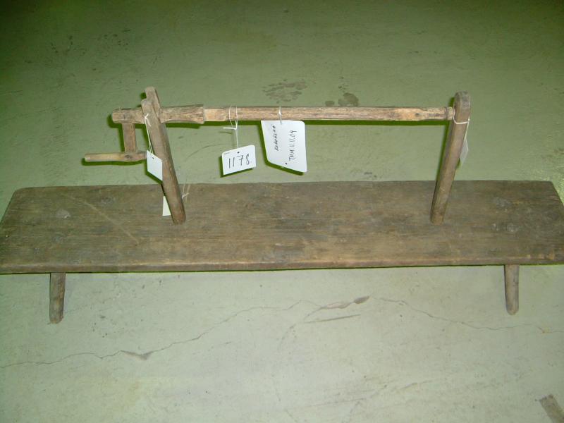 Puinen penkki, jonka molemmissa päissä kaksi jalkaa, joiden tapit tulee penkin toiselle puolelle. Penkin molemmissa päissä on ylöspäin nousevat laudat. Toinen lauta on alhaalta kolmion muotoinen, sitten siinä on neliön muotoinen osa ja yläosa muistuttaa 2 piikkistä haarukkaa. Toisen laudan alaosa on samanlainen, yläosa on soikea ja siinä on reikä keskellä. Näiden välissä on puu, joka pyörii kampea vääntämällä.