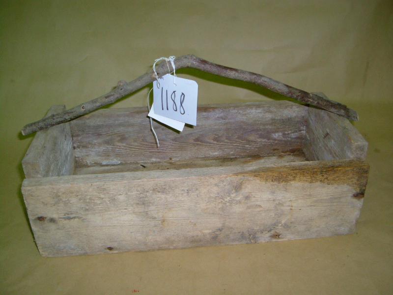Laudoista tehty suorakaiteenmallinen pakki, jossa päätylaudat ovat sivulautoja korkeammat. Kiinnitys nauloin. Kahvaksi laitettu puunoksa.