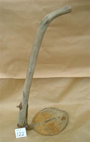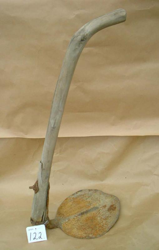 Yläpäästä kaartuva varsi maalaamatonta puuta. Terä rautaa, muodoltaan lähes pyöreä. Terä on kiinnitetty varteen rautalenkillä ja pultilla.