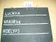 Suorakaiteen muotoinen vanerilevy. Väriltään musta. Teksit ja viivat maalattu valkoisella. Yläreunassa kolme reikää, joissa rautalankaa ripustusta varten.