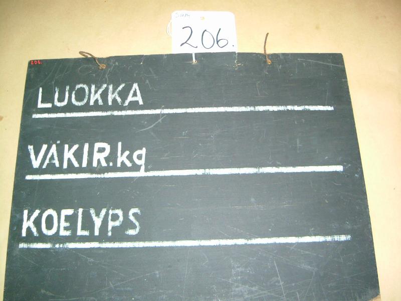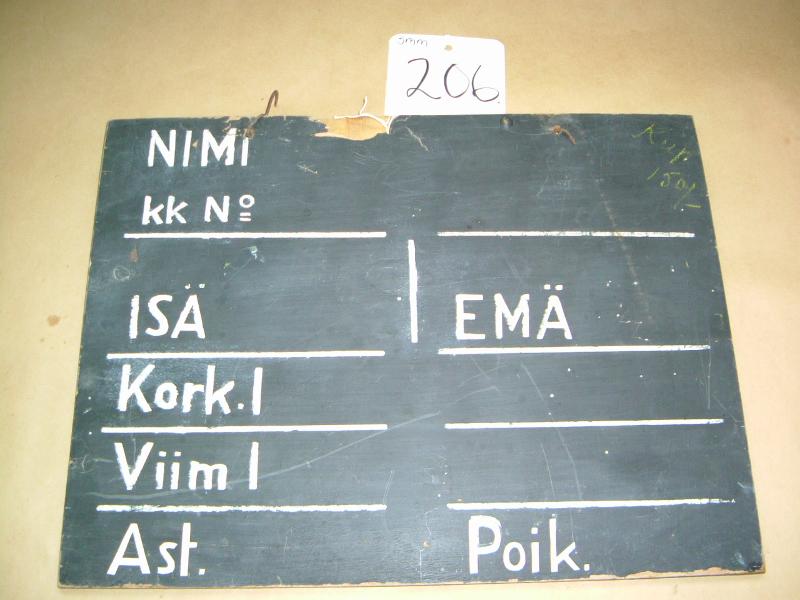 | huomiot | Viiteet ja lähteet: Muistio lahjoituksesta. Lahjakirja nro 50.; Merkit: Maalattu: NIMI ja kk No, ISÄ, EMÄ, kork.l, viim.l, Ast., Poik Toisella puolella: LUOKKA, VÄKIR.kg, KOELYPS Kirjoitettu keltaisella liidulla: Kup (epäselvä) 150/_; Lahjoittaja: Juhani Heikola; Valmistus: Todennäköisesti tehty Pomparin tilalla. |