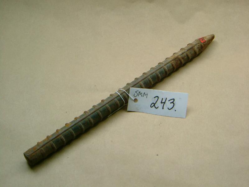 Harkkorautainen tangon palanen, alapää teroitettu, yläpää saman levyinen kuin tanko itse. Maalamaton.
