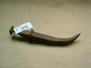 | huomiot | Viiteet ja lähteet: Muistio lahjoituksesta.; Vauriot: Ruostetta; Lahjoittaja: Helga Sandell; Valmistus: Todennäköisesti Alvi Sandellin tekemä kotiahjossaan. Muurla, Varsinais-Suomi.; Lisatiedot: Esineet 209.-219. ja238.-258. kuuluvat samaan kokonaisuuteen, joka on kerätty Alvi Sandellin kotitarvepajasta. |