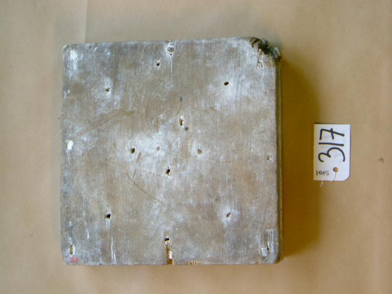 Pohjakappale neliön mallinen, sisäpuolella koristekuvio, jossa keskellä tähti ja tähden ympärillä kalanruotokuviota. Reunat kiinnitetty pohjaan puutapeilla. Pohjassa reikiä.
