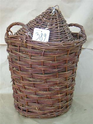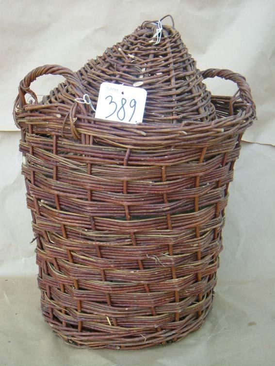 Ylöspäin hieman levenevä pyöreäpohjainen punottu kori, jossa vastakkaisilla puolilla kantokahvat. Päällä kartionmallinen irrallinen kansi. Korin sisällä korin täyttävä vihertävä lasipullo. Pullonsuun h=5,8 cm.