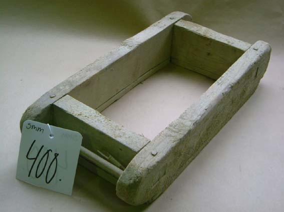 Neljästä kapeasta laudankappaleesta tehty suorakaiteen mallinen kehikko. Pitkien sivujen seinät jatkuvat kehikon yli ja ylimenevissä osissa on poikkipuut kahvoina. Kehikon kohdalla on muotin toisella puolella lautojen lisäksi kapeat rimat. Muotti on hieman savinen.
