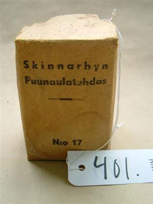 | huomiot | Viiteet ja lähteet: Eeva Mikolan muistio 11.9.2001 Luovutusasiakirja, liite 11.9.2001; Merkit: Skinnarbyn Puunaulatehdas N:o 17 Skinnarby Pliggfabrik N:o 17; Vauriot: Paketti kupruillut ja rikki; Lahjoittaja: Esteri (Mäkisepän tila) Koivisto |
