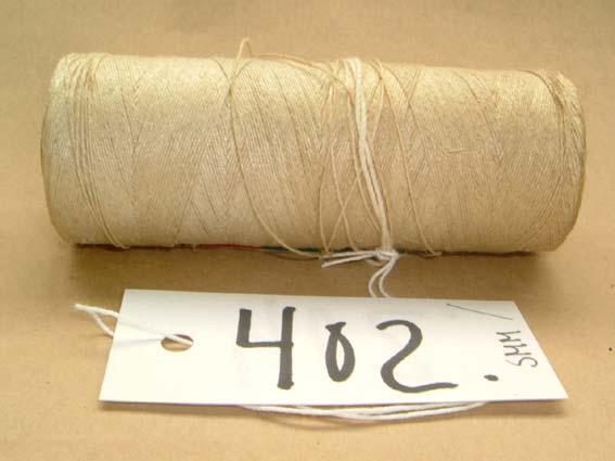 Pahvisen putkilon ympärillä rulla valkoista pellavalankaa. Lankaa ei ole paljoa käytetty.