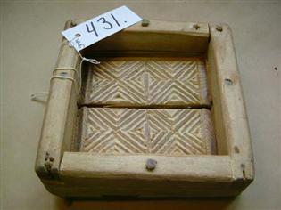 Useammasta erillisestä palasta koottu juustomuotti, jossa reunat on yhdistetty pohjaan puutapeilla. Pohja kuudesta eri palasta ja muotti pohjasta keskeltä kokonaan halki. Muutenkin palat irronneet osittain toisistaan. Muotti on neliön muotoinen, pohjassa on koristekuvio, jossa neljän ruudun sisällä on rastimaisia kuvioita, joiden sivustalla puolestaan kolmiomaisia kuvioita.
