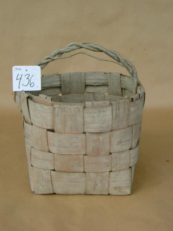 Lähes kuution mallinen, päreistä punottu kori, jossa kiertämällä punottu kantokahva. Korin sisäpinnassa kuivunutta savea tai multaa (ollut ilmeisesti pellolla).