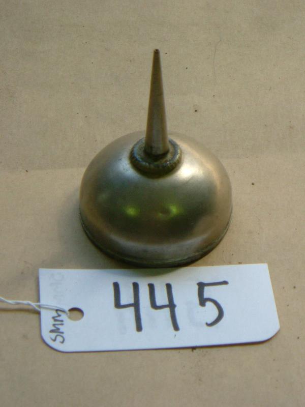 Pieni hopeanvärinen öljykannu, jossa puolipallon muotoinen alaosa, josta lähtee suoraan ylös nokka, joka kapenee ylöspäin.