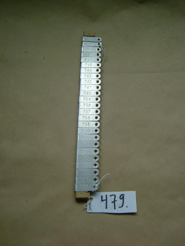 Metallisia korvamerkkejä numerosta 726(alhaalla) numeroon 750 päällekkäin puisessa kapulassa. Merkit on painettu kiinni kapulaan ja niissä on numerot päälipuolella. Merkin oikeassa laidassa on reikä. Merkit ovat suorakaiteen muotoisia, toisesta päästä pyöristettyjä. Molemmissa päissä puukapulaa naulattu pienet puulevyt estämään merkkien tippumista.