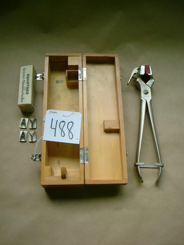 Käsiteltyä puuta oleva, suorakaiteen muotoinen, liitoksin yhdistetty laatikko, joka päältä avautuva. Kansi ja pohja kiinni toisissaan metallisilla saranoilla. Laatikon edessä 2 salpaa lukitukseen. Keskellä pieni hopeanvärinen laatta, jossa lukee mustalla Hauptner. Laatikossa sisällä vastakkaisissa kulmissa pienet puupalikat sekä "tuolimaiset" palikat. Laatikossa on sisällä tatuointirauta. Raudassa on kapeat litteät kädensijat, jotka saa painettua yhteen ja erikseen ja ne saa kiinni metallilenkin avulla. Kädensijat menee yläpäästä ristiin ja ne on kiinnitetty kyseisestä kohdasta ruuvilla. Kädensijojen yläpäässä on neliön malliset osat. Toisen päässä on punainen muoviosa ruuveilla kiinni, toisessa päässä on keskeltä jaettu metalliosa, johon tatuointimerkit tulevat. Tämän toisella puolella on jousen avulla toimiva osa. Sisällä on myös pahvinen suorakaiteen muotoinen rasia, jossa mustaa tekstiä, ja jonka sisällä on tuubi tatuointiväriä. Lisäksi 4 kappaletta merkkejä, joihin tatuointiväriä laitetaan, ja joiden avulla merkki painetaan korvaan. Merkeissä kahdessa on kirjain A ja kahdessa on kirjain Y neliönmuotoisella litteällä alustalla. Kirjaimet koholla olevia ja tehty pienistä niiteistä.