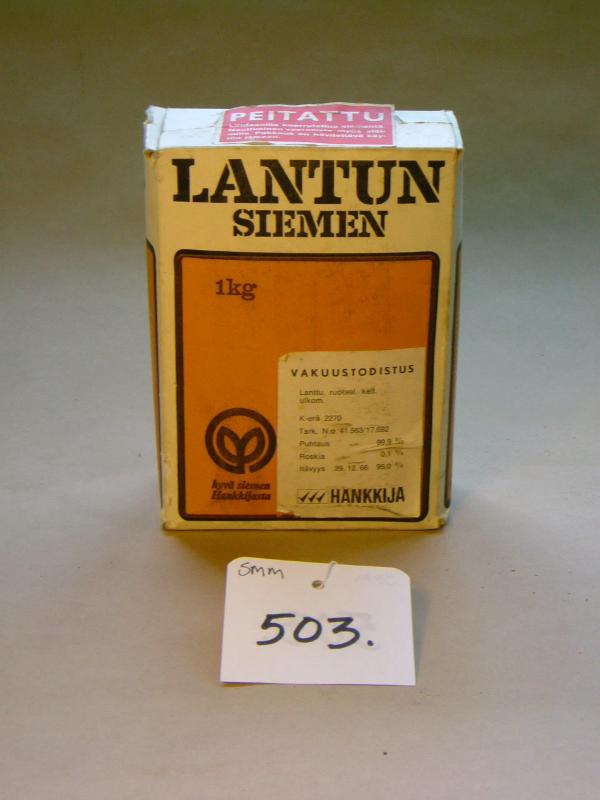 Kartongista valmistettu kilon paketti lantun siemeniä. Paketin päävärit ovat valkoinen ja oranssi, tekstit mustalla. Edessä ja takana tekstit: LANTUN SIEMEN, 1kg, hyvä siemen Hankkijasta. Edessä erikseen liimattu valkoinen Hankkijan vakuustodistus. Sivuilla piirroskuvat lantusta sekä teksti: HANKKIJA ja Hankkijan logo. Toisella sivulla pieni teksti otsikolla: "Hyvä siemen - kunnon sato", ja toisella siementen käyttösuositus. Paketin päällä erikseen liimattu punainen varoituslappu, jossa teksti on valkoisella: "PEITATTU. Lindaalilla kuorrutettua siementä. Nauttiminen vaarallista myös eläimille. Pakkaus on hävitettävä käytön jälkeen."