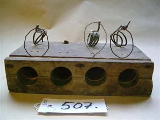 | käyttötapa | Hiirien surmaaminen. Puuosassa oleviin koloihin on laitettu hiirtä haukuttelevaa ruokaa. Ruokaan kiinnitetty lanka on pitänyt alhalla kojen edessä olevia, metallilangasta tehtyjä silmukoita. Hiiren syödessä herkkupalaa, se samalla syö langan poikki, jolloin silmukka ponnahtaa ylöspäin ja hiiri jää kuristuksiin. |