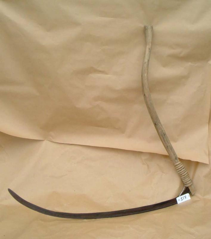 | huomiot | Viiteet ja lähteet: Muistio lahjoituksesta 2001. Vuorela, Toivo (toim.) Suomen kansankulttuurin kartasto: Porvoo; Wsoy 1976.; Vauriot: Esine on konservoitu ja se on näyttelykelpoinen.; Lahjoittaja: Esteri (Mäkisepän tila) Koivisto; Valmistus: todennäköisesti terä sepän valmistama ja varsi kotitekoinen.; Lisatiedot: Viikate on heinän, myöhemmin myös viljan niittämiseen käytetty teräase. Sillä työskenneltiin molemmin käsin asetta heiluttaen. 1900-luvun alussa oli käytössä viisi päätyyppiä: Väärävarsi, kaksipolvinen väärävarsi, suora oksavarsi, kynkkävarsi ja pitkävarsi. Väärävarsi viikatteen levinneisyysalue lienee aikaisemmin peittänyt koko maan. Sillä niitetään lyöden oikealta vasemmalle ja päinvastoin. Päätekohdassa viikate pyörähti ympäri. Tekniikka oli erittäin tarkoituksenmukainen epätasaisella luonnonniityllä, jolla oli kiviä, kantoja ym. (Vuorela 1976, 44). |