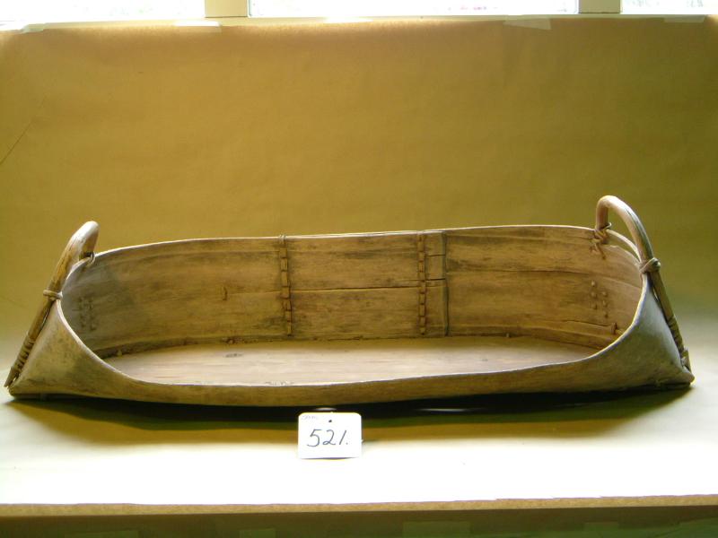 Soikea , toiselta puolen loivasyrjäinen astia. Pohja valmistettu yhdestä ohuesta laudasta ja samoin laita on taivutettu yhdestä ohuesta laudasta. Kiinnitys niteellä. Kädensijat on tehty taivutetuista oksista ja kiinnitetty pohtimeen niteellä. Puuhun tulleita halkeamia on ommeltu kiinni niteellä. Oksan kohtiin tehty reiät ja ne on täytetty puutapeilla.