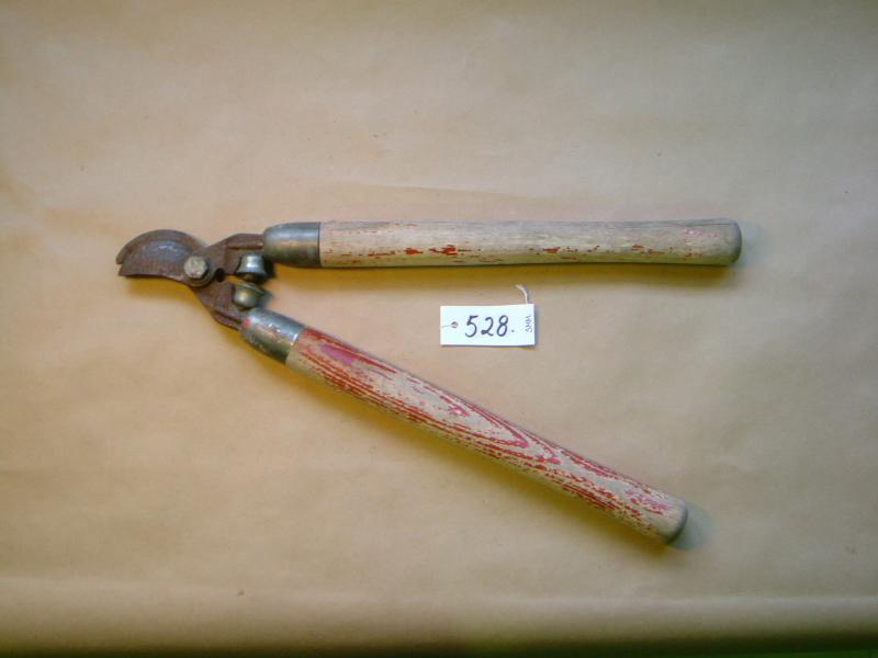Oksasaksien kahvat ovat puuta ja ne ovat punaiseksi maalatut. Maali on hilseillyt pois lähes kokonaan. Kahvojen halkaisija on 3,4 cm. Terät ovat ruostuneet. Ne liikkuvat mutteriruuvin varassa. Terien tyvessä kumitäytteiset alumiinitapit, jotka osuvat toisiinsa leikatessa ja joustavat. Terien ja kahvojen liitoskohdassa on alumiiniset mansetit.