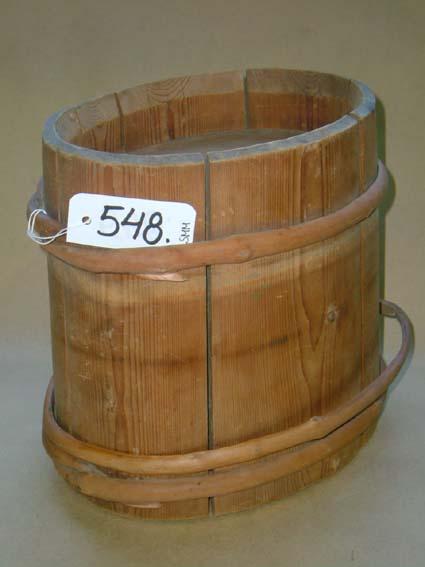 | huomiot | Viiteet ja lähteet: Eeva Mikolan muistio lahjoituksesta 11.9.2001 Kautovaara, Pekka: Kättentöitä, Keuruu; Otava 2002.; Vauriot: Tapit puuttuvat, yksi vanne irti.; Lahjoittaja: Esteri (Mäkisepän tila) Koivisto; Lisatiedot: Erillisistä laudoista eli kimmistä kootut puuastiat olivat ennen yleisiä. Kimpiastioiden tuli olla vesitiiviitä. Kimpilaudat tuli muistaa halkoa puun sydämeen päin tai astia aikaa myöten halkeilee. Tehdessä astian sisäpuolelle laitetaan tukki, joka pitää laudat pystyssä kiinnityksen ajan. (Kautovaara 2002, 115-117.) |