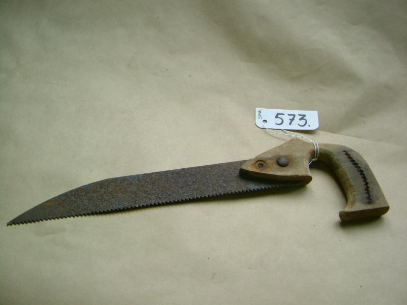 Sahalaitainen terä on kapeahko (n. 4 cm) ja se suippelee päästään. Kahva lakattua puuta ja siinä on toisella puolella upotettu sahalaitakuvio korosteena. Kahva on kiinnitetty terään niitein.
