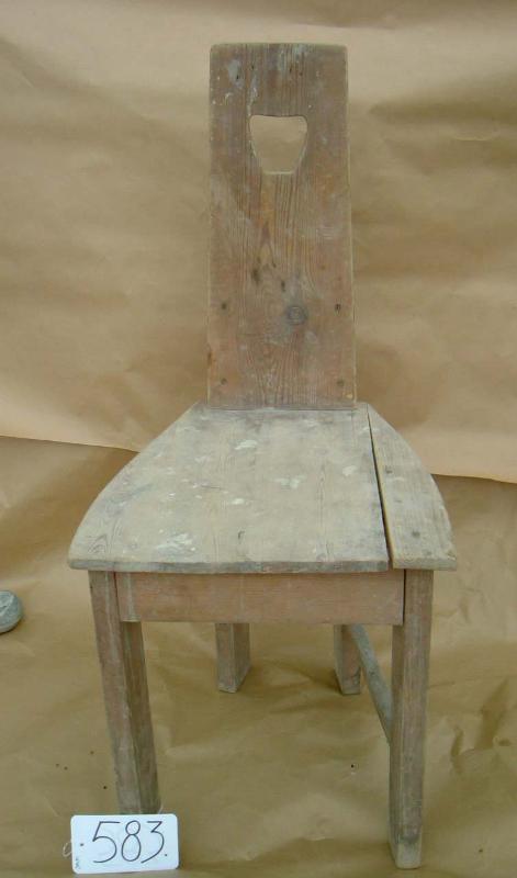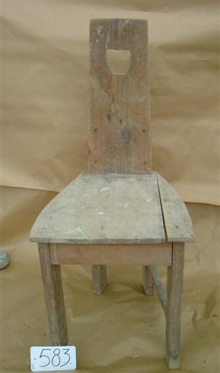 Maalaamaton, puinen tuoli. Selkänoja muodostuu yhdestä laudasta jonka yläosassa on aukko (ylöspäin levenevä neliö, pyöristetyt kumat). Selkänoja kapenee himan ylöspäin, leveimmillään se on 19,8 cm leveä. Takajalat ovat etujalkoja kapeammalla, ne jatkuvat selkänojan tueksi. Jalkojen välisistä tukipienoista toinen puuttuu. Istuin kahdesta laudasta ja se kapenee taaksepäin.