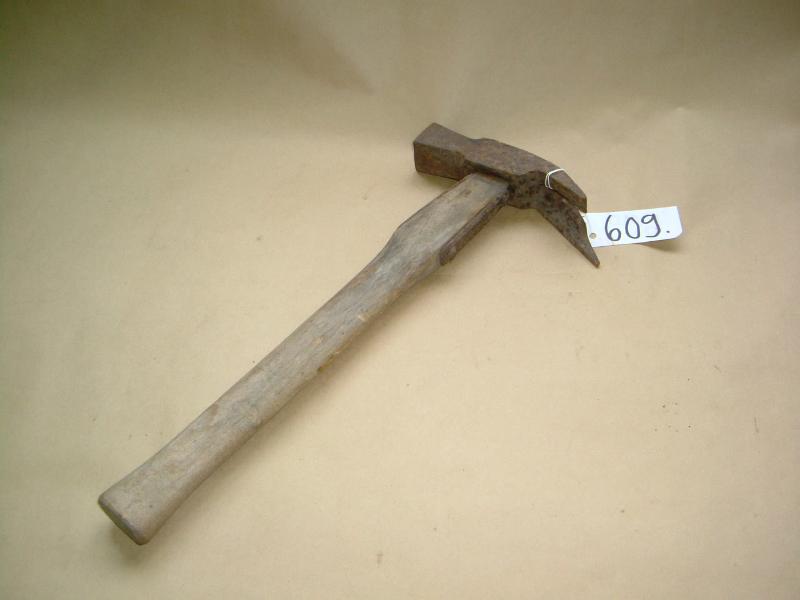 Pitkä pyöristetty puinen varsi, vasara päästä litteämpi. Varressa n. 1/4 osa matkalla sivussa metalliset litteät osat. Vasaraosa on toisestä päästä neliömäinen ja sitä on käytetty naulaamiseen. Toinen pää haarautuu kahteen terävään osaan. Rautaosassa on tekstiä, mutta siitä ei saa selvää.