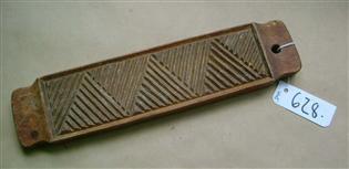 Suorakaiteenmallinen muotti, joka päistä pyöristetty. Toisella puolella koristelupuuta on uurrettuja suurempia lomittain olevia kolmioita, toisella puolella samanlainen kuvio, mutta kolmiot pienempiä, joten kuvio mahtuu toistumaan 2 kertaa. Keskellä kuviota menee vako. Laudan reunat korkeampia kuin itse kuvio. Laudan toisessa päässä on reikä.