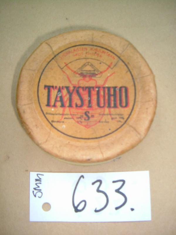 | huomiot | Valmistusaika: 1940-luku.; Lahjoittaja: Arja-Maija Topi-Hulmi-Lumento; Valmistus: Vaasan tehtaat - Vasa Fabriker; Käyttöaika: 1940-50-luku.; Viiteet ja lähteet: Muistio lahjoituksesta 2.4.2004 Lahjakirja nro 54.; Merkit: Kannessa: Punainen kuva syöpäläisestä, musta kolmio TÄYSTUHO Syöpäläisten torjuntaan RIKKIHAPPO ja superfosfaattitehtaat Oy Vaasan tehtaat; Vauriot: Rasiaan tullut painaumia.; Lisatiedot: Eläinlääkepurkkien sisältö viety apteekkiin 17.6.2004, purkit ovat tyhjiä. |