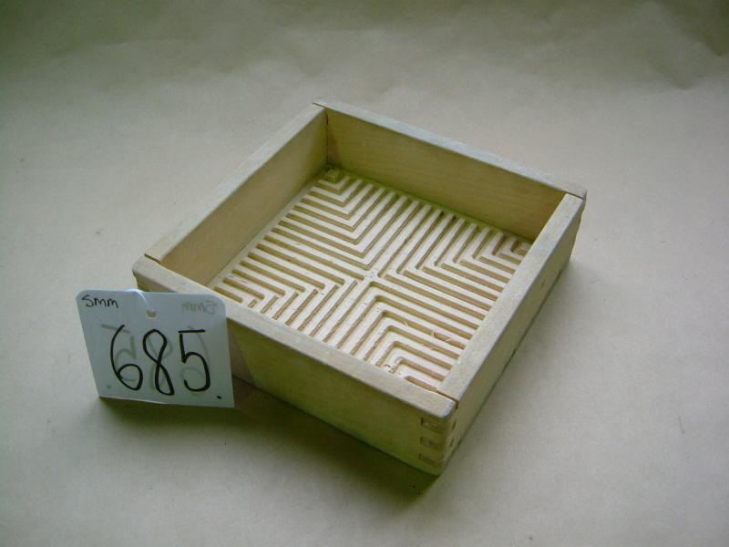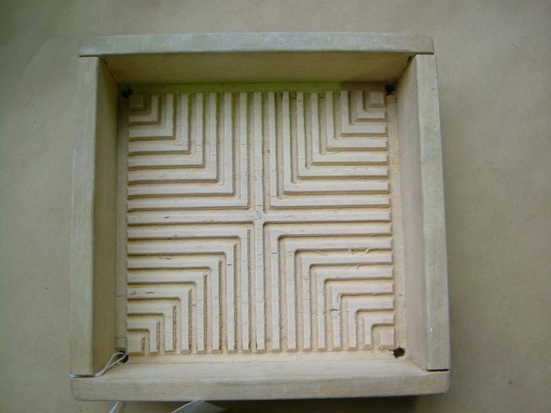 Neliönmuotoinen, reunallinen muotti. Reunat on kiinnitetty toisiinsa liitoksin. Pohja reunoissa kiinni ruuveilla. Pohjaan on kaiverrettu kuvio, jossa on keskellä suuri risti, joka jakaa pohjan neljään osaan. Jokaisessa neljässä osassa on laitoja kohti pieneneviä v:n mallisia kuvioita.