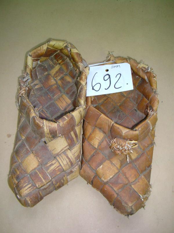 Tuohesta tehdyt kengät. Virsujen sisäpuoli on suora ulkoreunat kulmikkaat. Takaosa pyöristetty. Oikeanpuoleisessa virsussa "koristeruusuke" edessä.