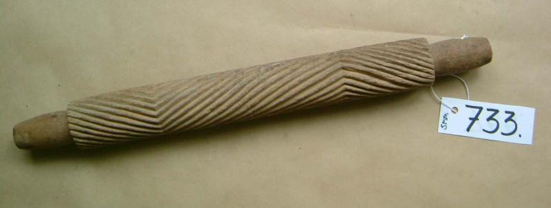 Kapea, pitkä kaulimenomainen puuesine, jonka pintaan uurrettu kuviointia. Kummassakin päässä kädensijat, toisen läpi kulkee reikä.