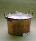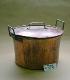 Suoraseinäinen kuparinen kattila. Kahvat hopean väriset, nousevat ylös yli reunan. Kansi kohoaa hieman keskeltä, kahva taivutettu kuparilevystä.