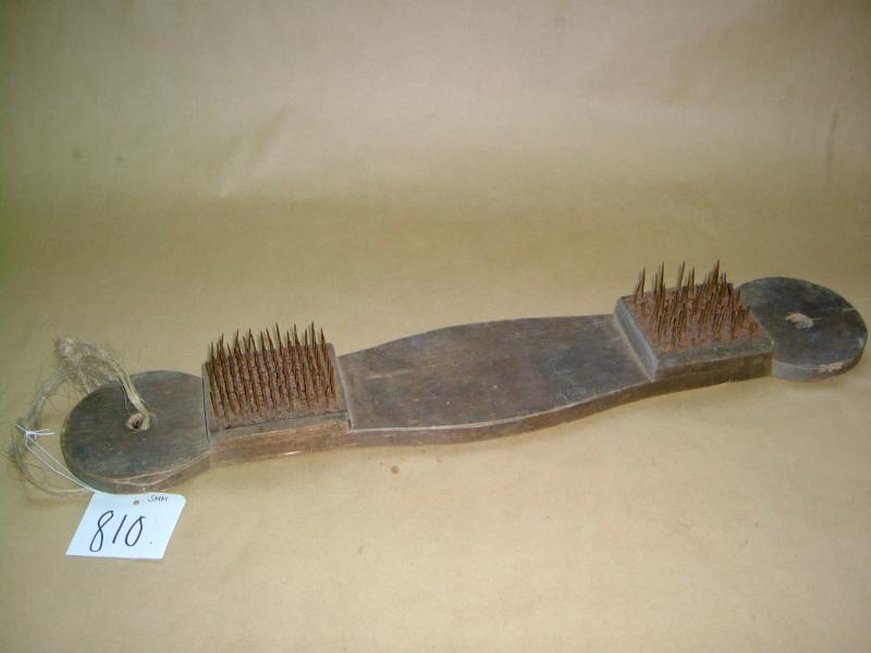 Ruskeaksi maalattu lauta, jonka päät ovat pyöreät ja niiden keskellä on reiät. Toisen läpi pujotettu pellavanaru. Lauta keskeltä hieman paksumpi. Pyöreiden osien vieressä neliön muotoiset osat, joihin laitettu rautapiikkejä, toiseen tiheämmin, toiseen harvemmin. (Neliön muotoisten peltien läpi on lyöty rautanauloja ja pellit on kiinnitetty puuhun niin, että naulan kannat ovat puuta päin.)